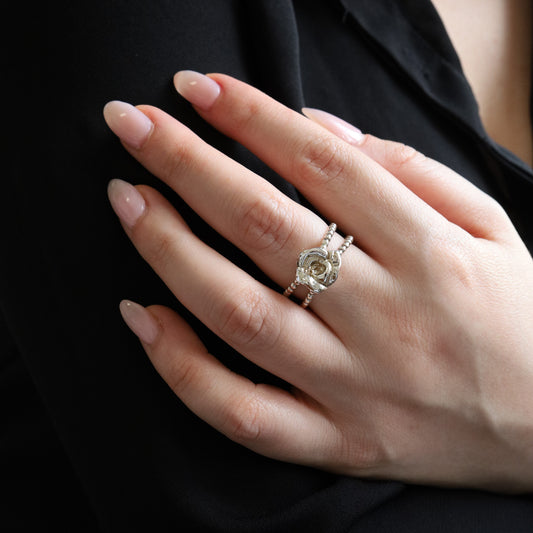 As a jewellery artist, her work is a dialogue between the ancient and the contemporary, the organic and the refined. She creates both hand-fabricated and hand-carved wax pieces, allowing each creation to evolve with a sense of purpose and intimacy.