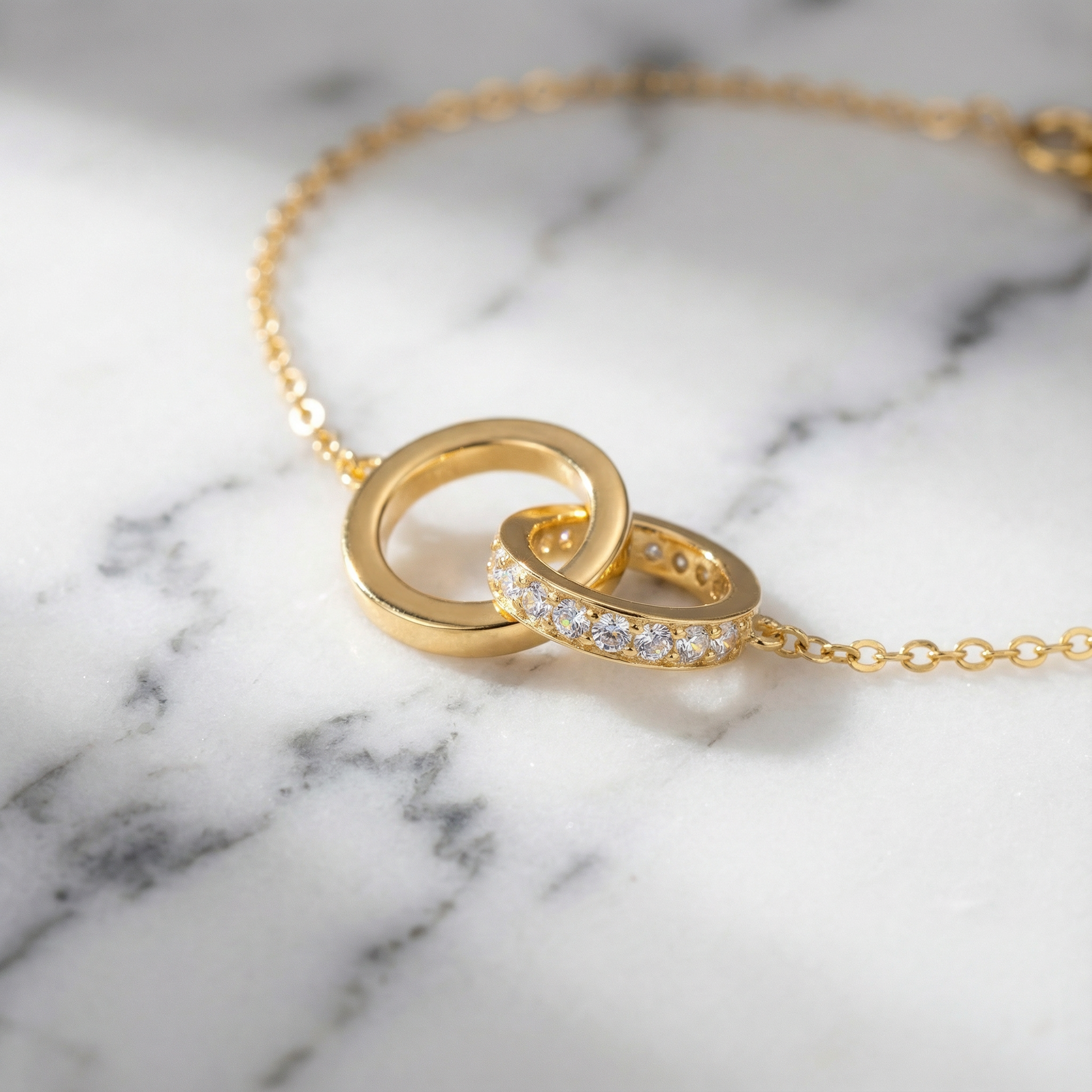 Discover a symbol of connection and endless style with the Interlocking Cubic Zirconia Bracelet from Dama Studio. This beautifully crafted piece features two intertwined circles, representing an unbreakable bond and infinite love. It's a delicate yet meaningful accessory, perfect for celebrating a special relationship or as a chic addition to your everyday look.