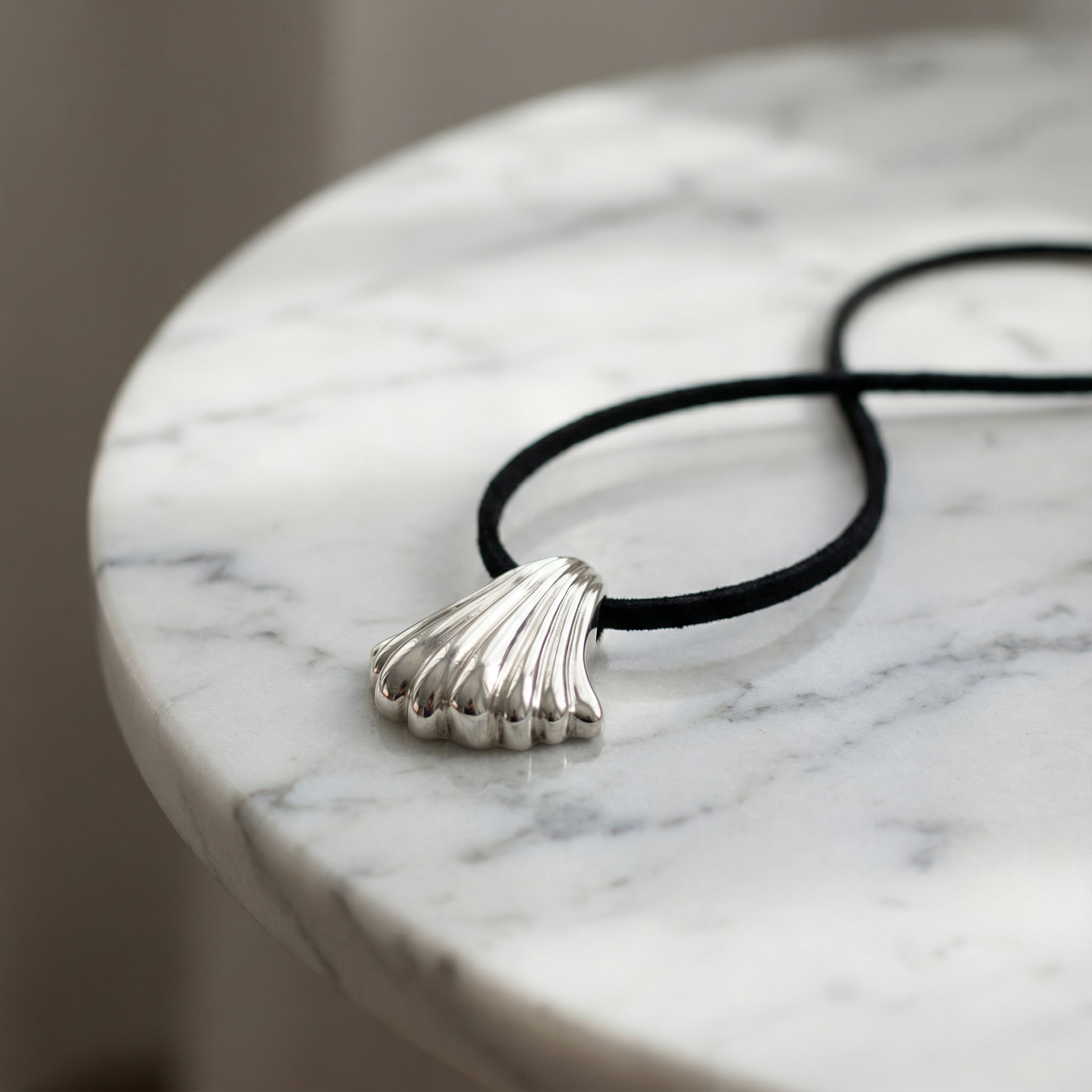 Make a statement with this modern and elegant Shell Necklace. Inspired by the perfect, fluted form of a scallop shell, this piece combines organic beauty with a bold, contemporary edge. The substantial 2cm pendant hangs from a soft, black leather cord, creating a beautiful contrast of textures and materials.