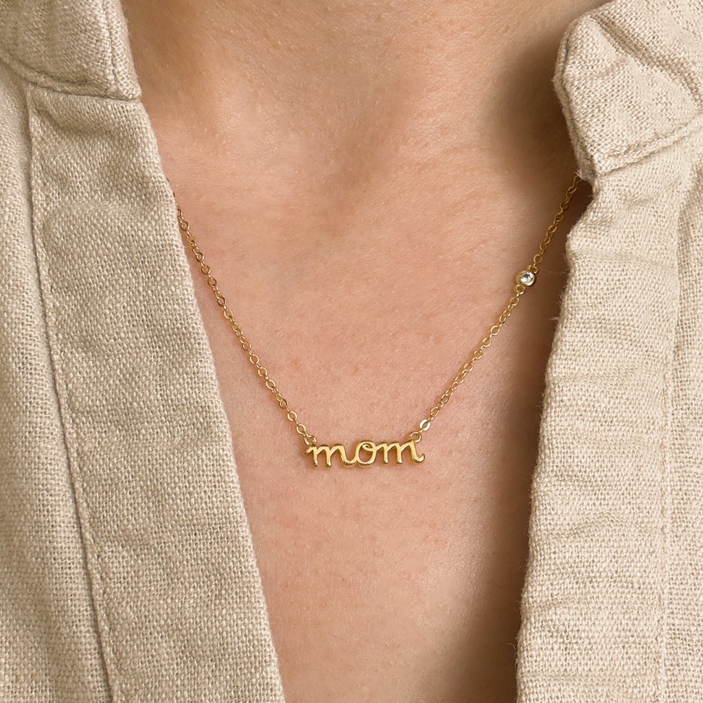 Este elegante Colar Cursiva Mom é a joia perfeita para todas as mães. Confeccionado em prata e banhado à ouro. Feito com materiais de alta qualidade, o colar apresenta uma bela fonte cursiva e brilhantes pedras de zircônia cúbica. Mostre seu amor e apreço por sua mãe com este colar deslumbrante e significativo.