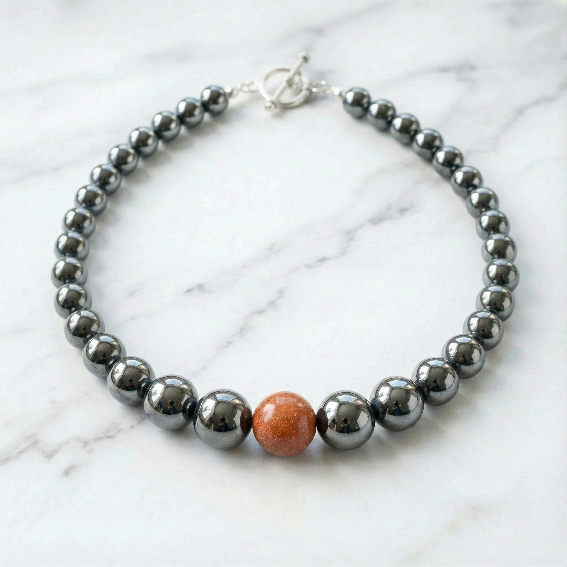 Celebrate sophistication and glamour with the Festive Necklace, a stunning handcrafted creation by renowned artist Lais Rapchan. This exquisite statement necklace features large, glossy onyx beads in a rich dark metallic grey and silver tone, perfectly complemented by a spectacular sandstone center stone in warm orange and copper tones with a beautiful sparkly, glittering finish. Perfect for those who love bold statement pieces, dramatic contrasts, and eye-catching elegance, the Festive Necklace is a true showstopper.